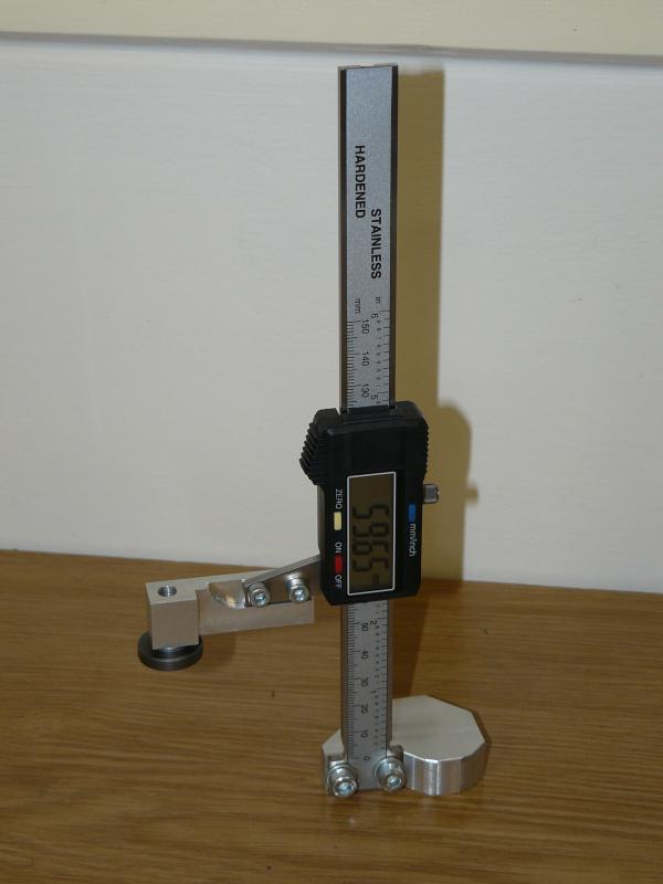 Alternativou k výše zmiňovaným způsobům nastavování délkové korekce osových nástrojů je použití tohoto speciálního výškoměru. Výškoměr je nutno nejdříve vynulovat na jakékoliv rovné ploše, poté se pomocí magnetů ve své základně upevní na plochu od které vychází délkové nástrojové korekce (například čelo revolverové hlavy soustruhu, rovná plocha na vřeteníku frézky a podobně) a pomocí měřícího doteku se odměří délka nástroje. Zobrazená hodnota je přímo hodnotou délkové korekce tohoto nástroje. Stačí ji tedy opsat do příslušného políčka tabulky korekcí nástrojů a nástroj je nastaven. Pro dosažení správných výsledků je nutné aby délkové korekce všech nástrojů vycházely ze stejného bodu od kterého probíhá měření.